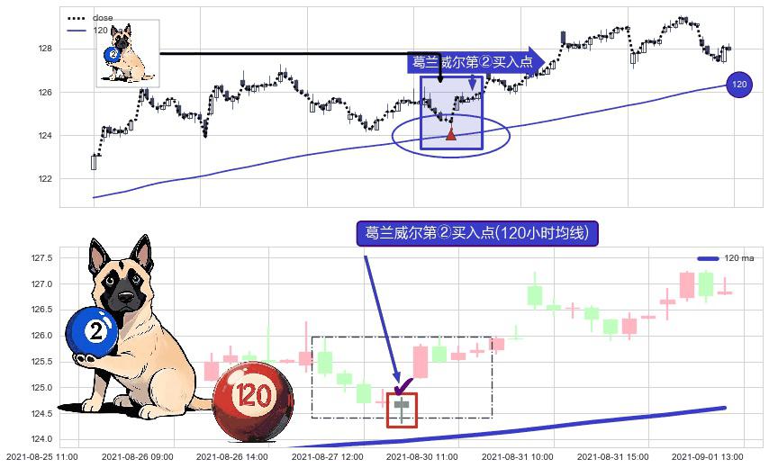 形态多维评估: ⚀ 2021-08-27 14:00:00-小时显现 葛兰威尔均线 120小时均线 第②买入点 上升趋势的中继信号,后市看涨,买进信号