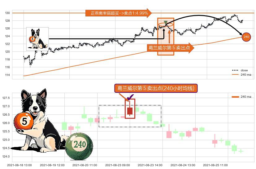形态多维评估: ⚀ 2021-08-23 09:00:00-小时显现 葛兰威尔均线 240小时均线 第⑤卖出点 上升趋势均值回复的短线回落信号,后市看跌,卖出信号