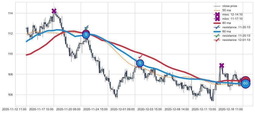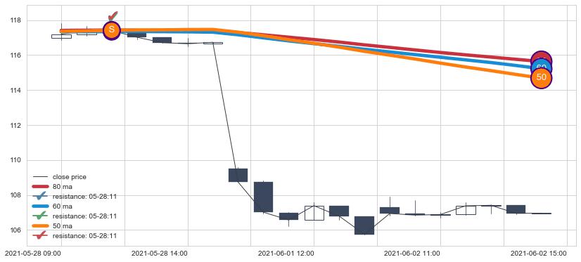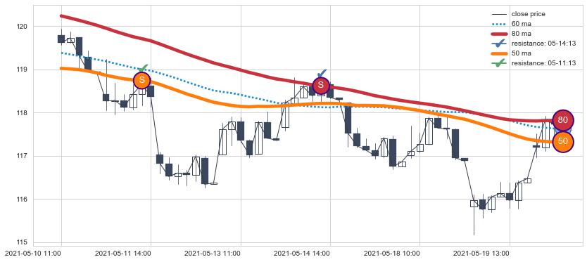 下跌趋势05-10 11:00-05-20 11:00,均线80, 50确认关键阻力2处