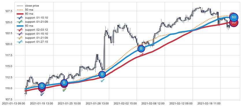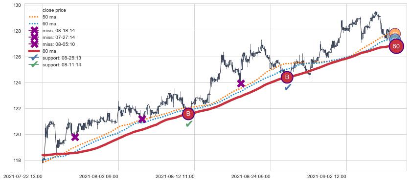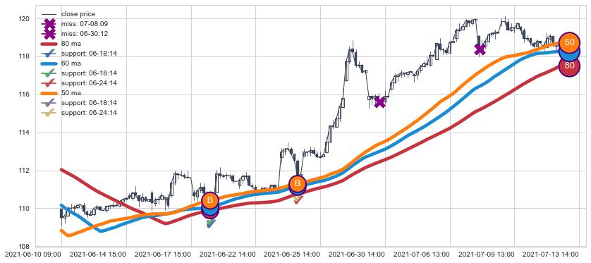 上涨趋势06-10 09:00-07-13 14:00,均线80, 50, 60确认关键支撑2处