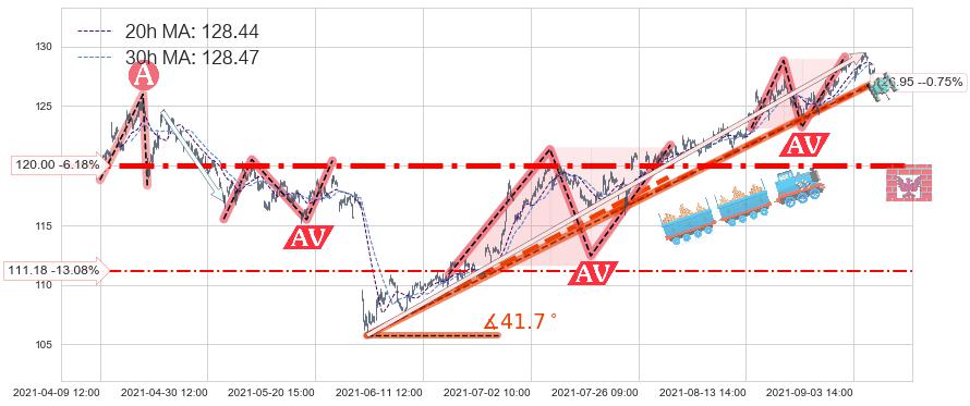 ♞ 20小时均线:128.44,30小时均线:128.47→ 快线<慢线