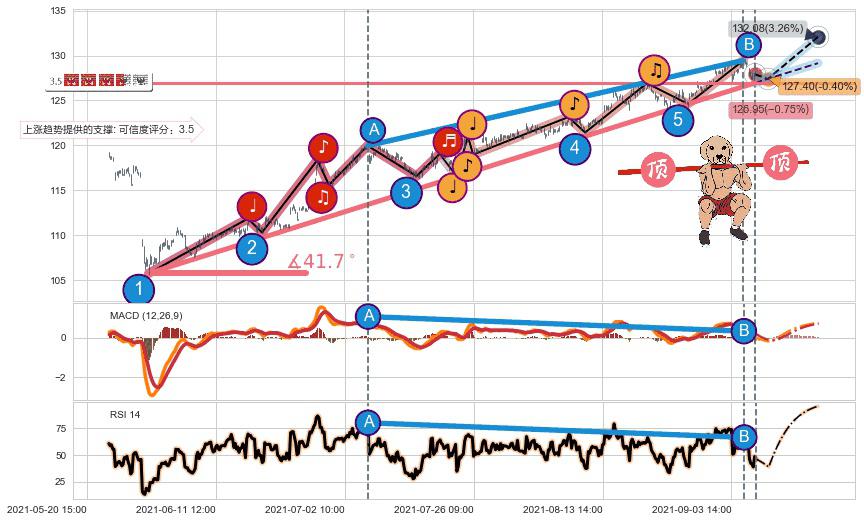 🍖 长线趋势跟踪组合短线均值回复[强支撑信号]2021-06-01 14:00-2021-09-09 14:00上升趋势依然成立(上涨趋势跟踪依然可行),短线价格略微下行回调(均值回复猜想),即将接近趋势提供的未破位的支撑价格:126.95。