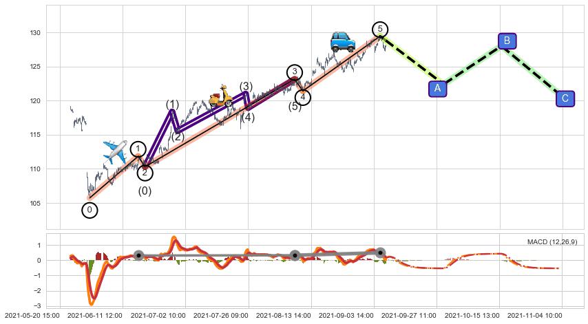 | 3 🅚:下跌两颗星 | 下跌三颗星 ➕ 🌊:波浪理论猜想上涨浪5已形成,猜想后续形成回调abc下跌(均值回复) ☞ 看空信号 ⇥ 【🅚线】交织【图形】⇥ 综合量化分数: 47 | > |