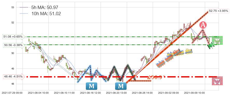 ♘ 阻力价格位50.56,可信任强度47.68%,距离最后交易2021-09-09 14:00形成的收盘价格50.75相差 -0.38%