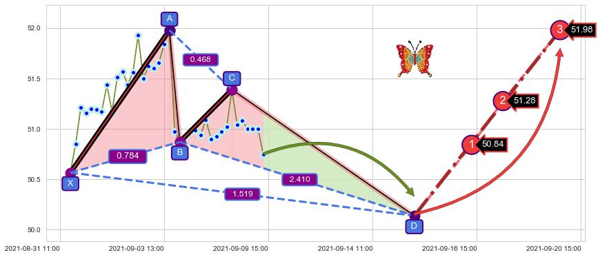 ➣ 未完成【蝴蝶】形态起点X: 08-31:13, 已到达C点: 09-08:14, 预测最终D点: 09-15:11, 共67交易小时
