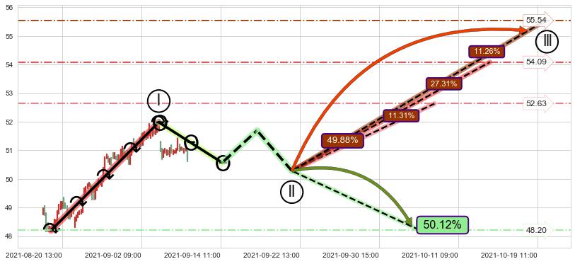 ➣ 循环浪继续向上【平均值】位置(10-13:13, 54.09),匹配聚类样本比例54.75%, 可能性概率27.31%
