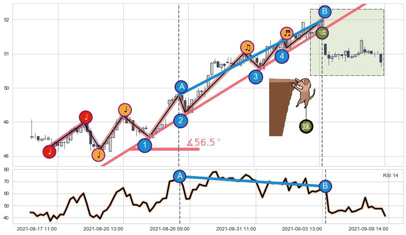 从2021-08-24 09:00至2021-09-07 10:00,共包含56个小时,阶段股价上涨4.72%,阶段股价变动位移路程比: 1 : 3