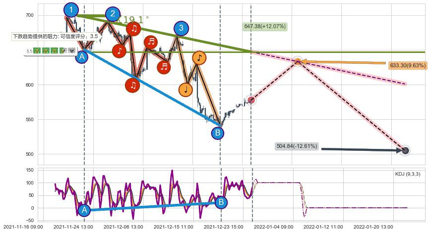 ♘ 在最后的下跌阶段2021-11-19 09:00至2021-12-22 10:00,存在 持续未破位的阻力位 ,阻力价格647.38,可信任强度77.91%,其距离最后价格577.68相差 +12.07%