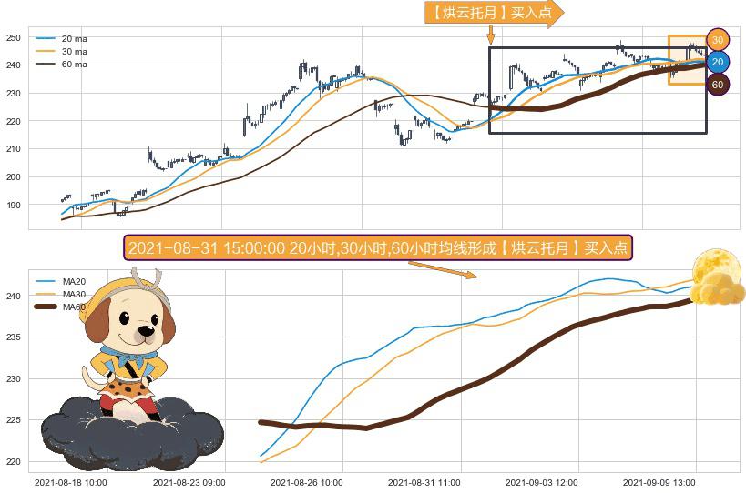 形态多维评估: ⚀ 2021-08-24 09:00:00小时-2021-09-09 15:00:00小时显现 20小时-30小时-60小时均线 【烘云托月】买入点 看多信号,后市看涨,买入