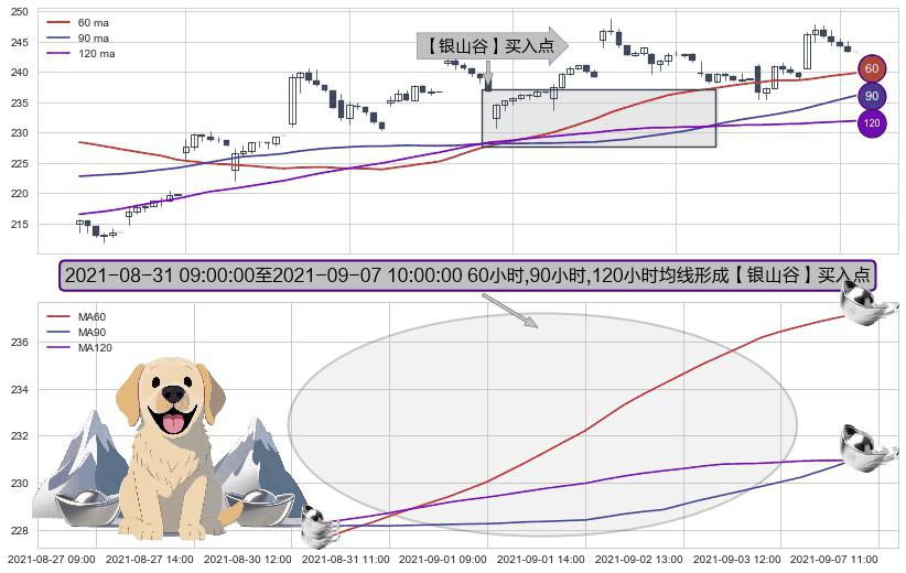 形态多维评估: ⚀ 2021-08-31 10:00:00-小时至2021-09-07 10:00:00-小时显现 60小时-90小时-120小时均线 【银山谷】买入点 看多信号,后市看涨,买入