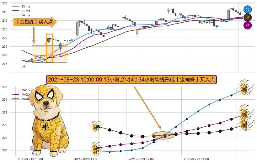 形态多维评估: ⚀ 2021-08-23 10:00:00小时显现 13小时-21小时-34小时均线 【金蜘蛛】买入点 看多信号,后市看涨,买入