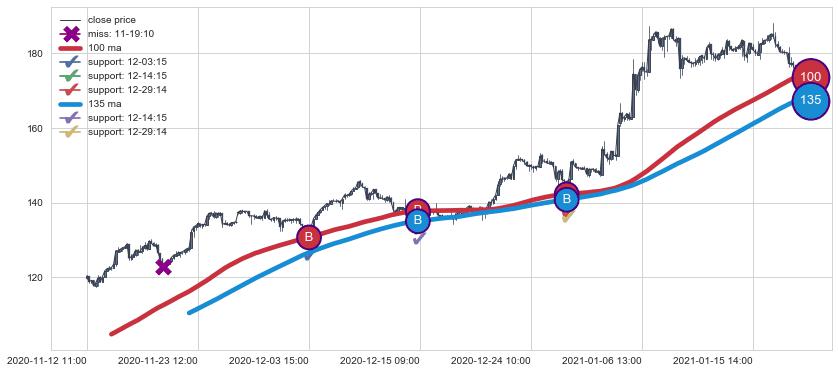 上涨趋势11-12 11:00-01-21 12:00,均线100, 135确认关键支撑3处