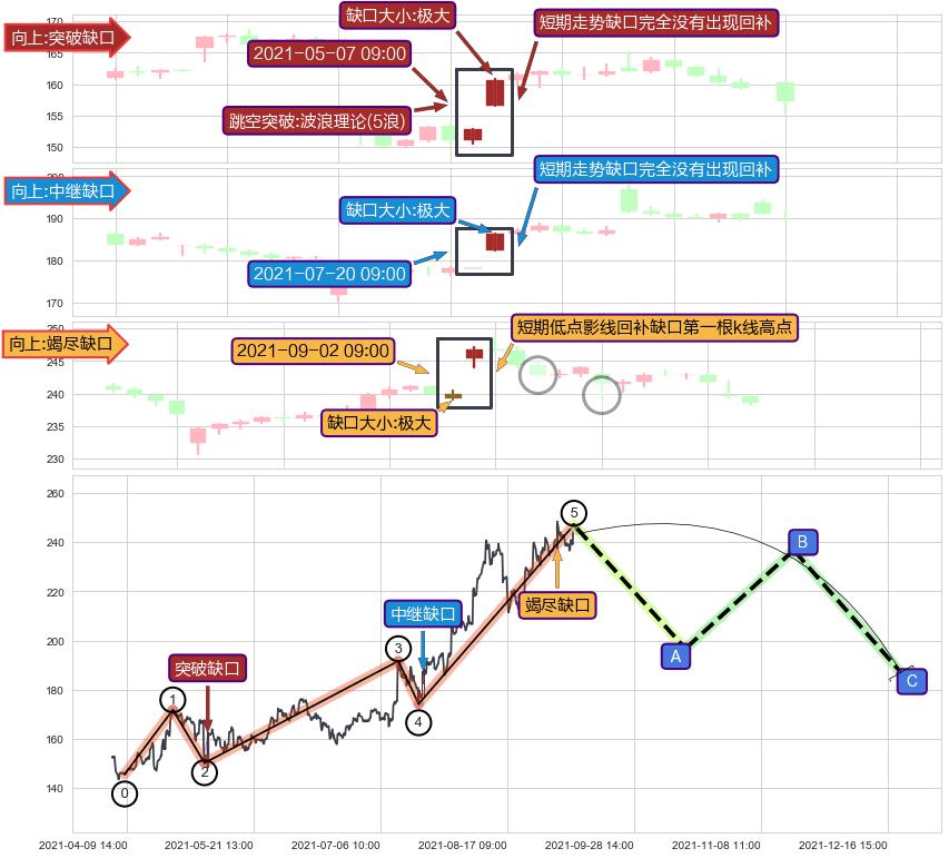 ➢ 跳空突破波浪理论(5浪)关键点后,后续非关键走势也无缺口回补迹象,突破缺口可信度提高