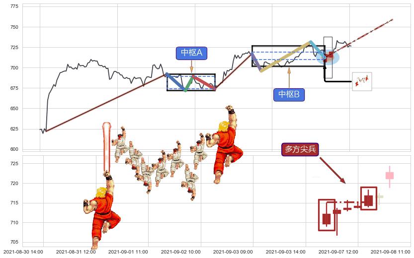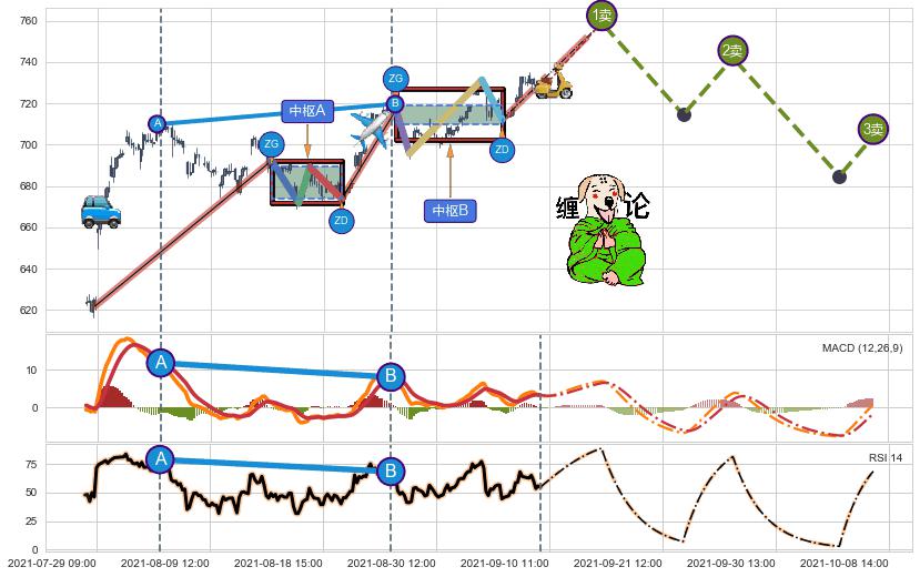 ➢ 【中枢B】:08-25:15-09-07:09,中枢由4笔构成,共48交易小时, ZG=716.90, ZD=712.17