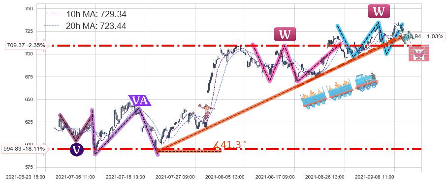 ♘ 在最后的上升阶段2021-07-19 13:00至2021-09-09 13:00存在 持续未破位的支撑位 ,支撑价格718.94,支撑可信任强度80.75%,其距离最后价格726.41相差 -1.03%