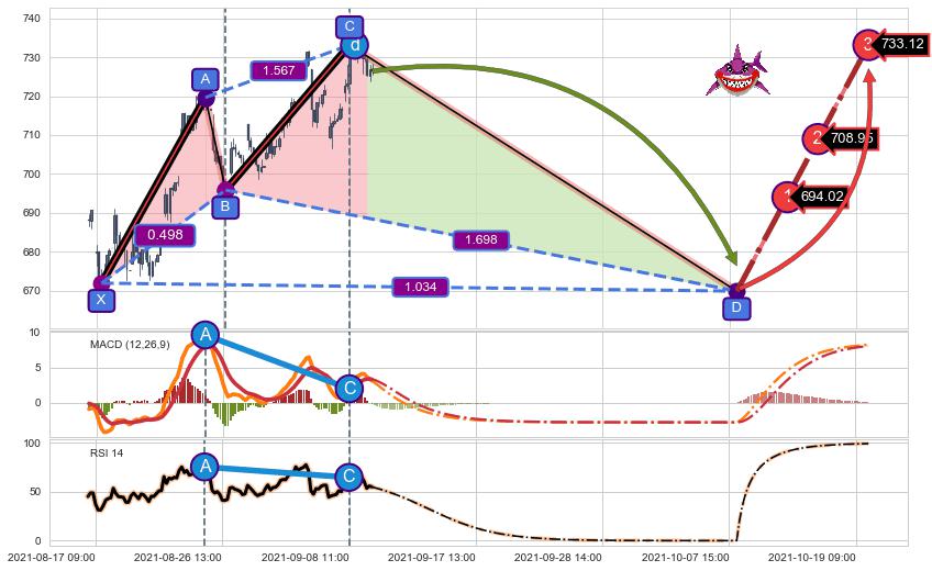 ➣ D点拟合预测价格669.85,距离最后交易收盘价格726.41相差 -7.79%