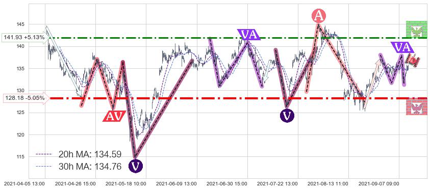 ♘ 阻力价格位141.93,可信任强度63.00%,距离最后交易2021-09-09 15:00形成的收盘价格135.00相差 +5.13%
