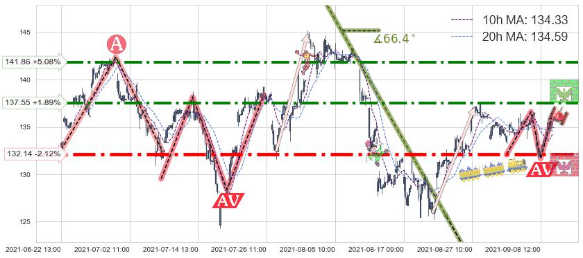 ➢ 【仅预测突破】最后价格:135.00与预测突破价格:137.60→【空间中等】后续最小【反转】第一目标价格→(09-17:10: 144.50 )