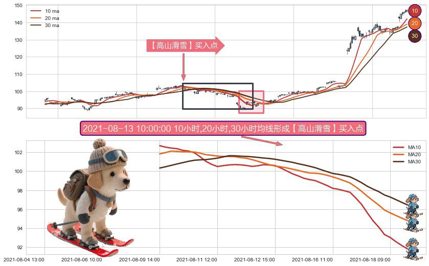 形态多维评估: ⚀ 2021-08-09 14:00:00小时-2021-08-18 12:00:00小时显现 10小时-20小时-30小时均线 【高山滑雪】买入点 看多信号,后市看涨,买入