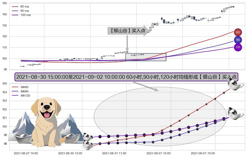 形态多维评估: ⚀ 2021-08-31 09:00:00-小时至2021-09-02 10:00:00-小时显现 60小时-90小时-120小时均线 【银山谷】买入点 看多信号,后市看涨,买入