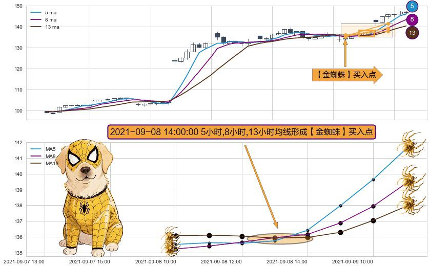 形态多维评估: ⚀ 2021-09-08 14:00:00小时显现 5小时-8小时-13小时均线 【金蜘蛛】买入点 看多信号,后市看涨,买入