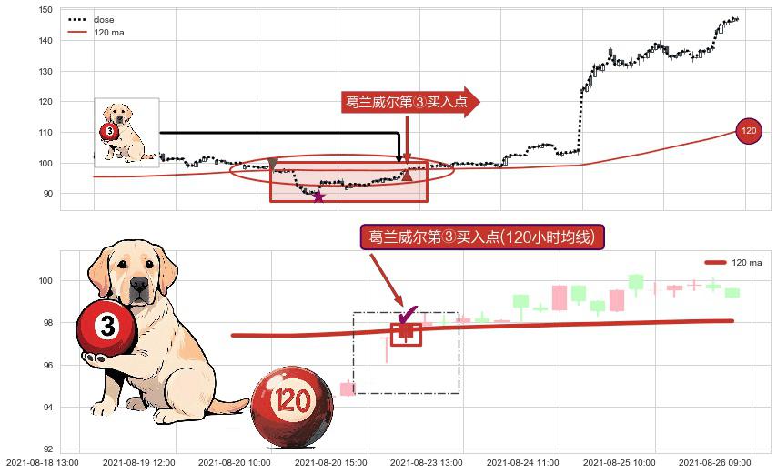 形态多维评估: ⚀ 2021-08-23 10:00:00-小时显现 葛兰威尔均线 120小时均线 第③买入点 上升趋势的中继信号,后市看涨,买进信号