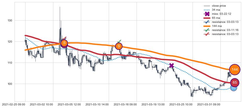 下跌趋势02-25 09:00-04-01 11:00,均线144, 65确认关键阻力2处