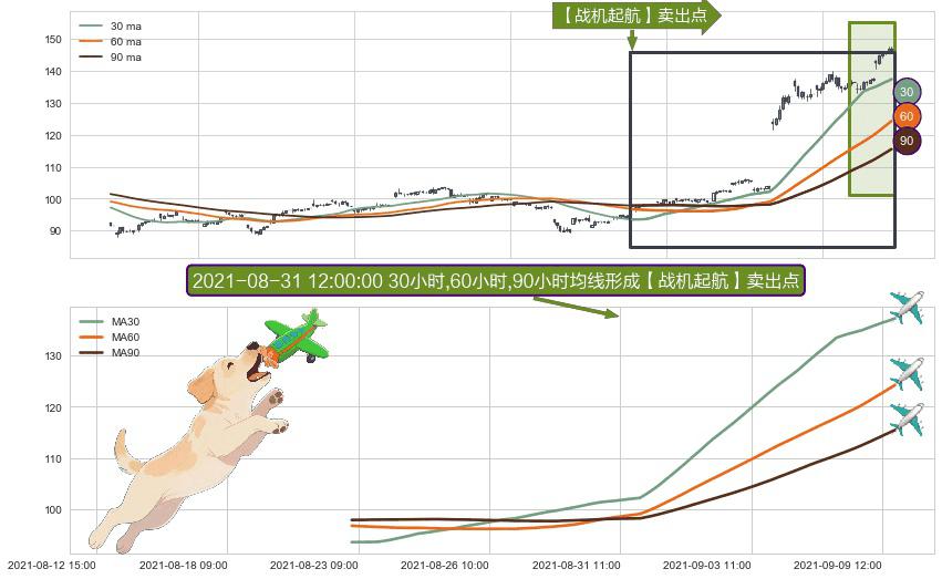 形态多维评估: ⚀ 2021-08-20 15:00:00小时-2021-09-09 14:00:00小时显现 30小时-60小时-90小时均线 【战机起航】卖出点 看空信号,后市看跌,卖出