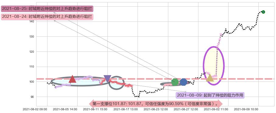 2021-08-25: 时域附近第一支撑位101.87持续的对上升趋势进行阻拦,有效放缓了上涨的速度。