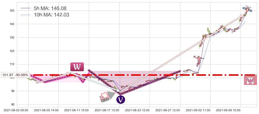 ♘ 支撑价格位101.87,可信任强度90.59%,距离最后交易2021-09-09 14:00形成的收盘价格146.34相差 -30.39%