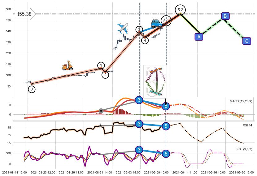 ➣ 5.1: 预测当前第5浪位置(09-09:13, 147.06),仍然有上升空间