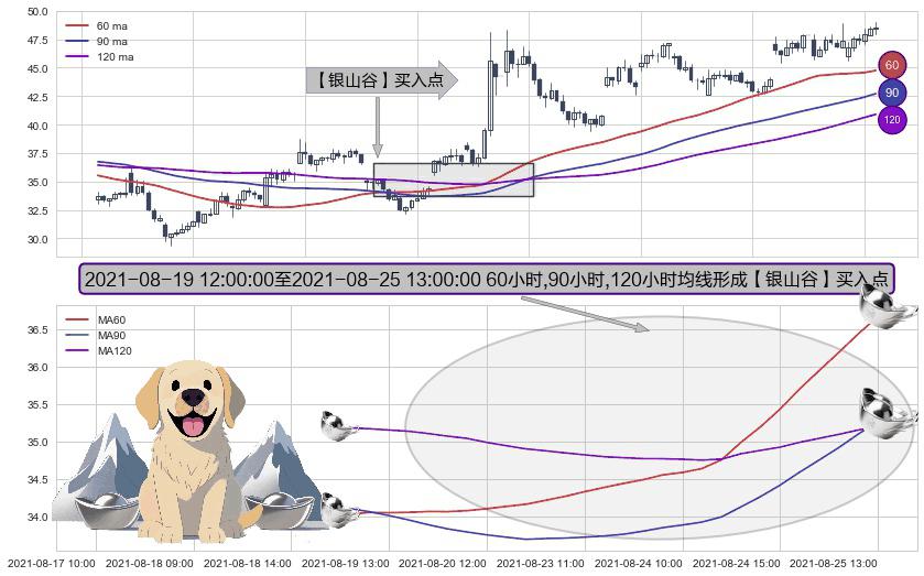 形态多维评估: ⚀ 2021-08-19 13:00:00-小时至2021-08-25 13:00:00-小时显现 60小时-90小时-120小时均线 【银山谷】买入点 看多信号,后市看涨,买入