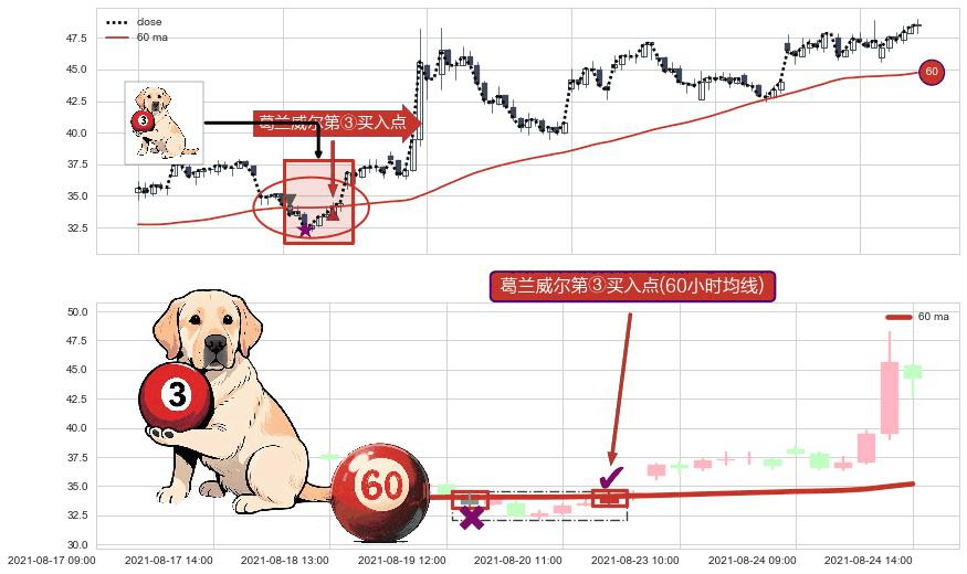 形态多维评估: ⚀ 2021-08-20 13:00:00-小时显现 葛兰威尔均线 60小时均线 第③买入点 上升趋势的中继信号,后市看涨,买进信号