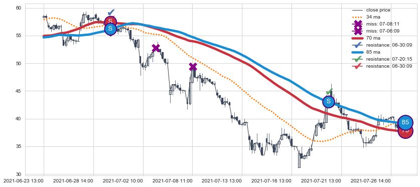 下跌趋势06-23 13:00-07-27 10:00,均线85, 70确认关键阻力2处