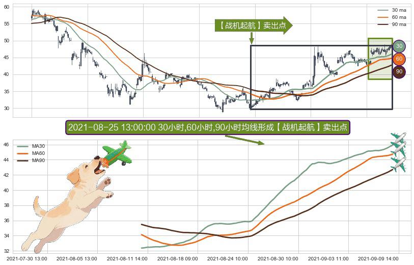 形态多维评估: ⚀ 2021-08-11 11:00:00小时-2021-09-09 14:00:00小时显现 30小时-60小时-90小时均线 【战机起航】卖出点 看空信号,后市看跌,卖出