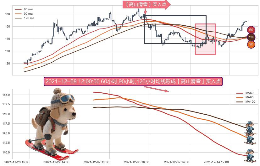 形态多维评估: ⚀ 2021-12-01 11:00:00小时-2021-12-15 14:00:00小时显现 60小时-90小时-120小时均线 【高山滑雪】买入点 看多信号,后市看涨,买入