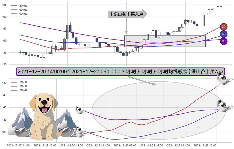 形态多维评估: ⚀ 2021-12-20 15:00:00-小时至2021-12-27 09:00:00-小时显现 30小时-60小时-90小时均线 【银山谷】买入点 看多信号,后市看涨,买入
