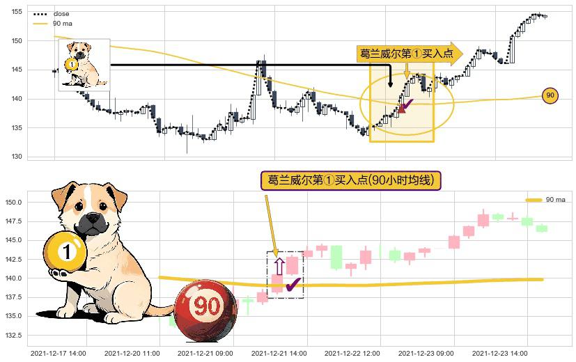 形态多维评估: ⚀ 2021-12-21 12:00:00-小时显现 葛兰威尔均线 90小时均线 第买①入点 走势反转见底信号,后市看涨,买进信号