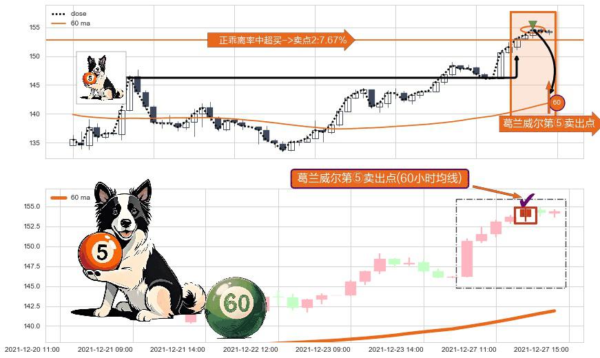 形态多维评估: ⚀ 2021-12-27 13:00:00-小时显现 葛兰威尔均线 60小时均线 第⑤卖出点 上升趋势均值回复的短线回落信号,后市看跌,卖出信号