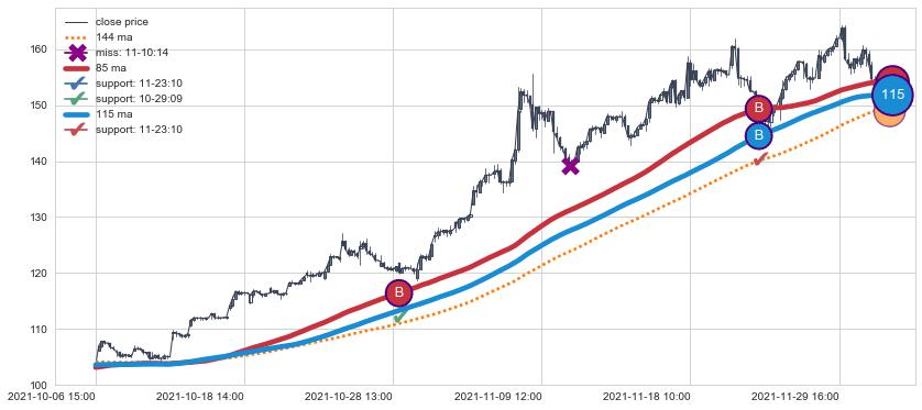 上涨趋势10-26 09:00-12-21 11:00,均线115, 85确认关键支撑2处