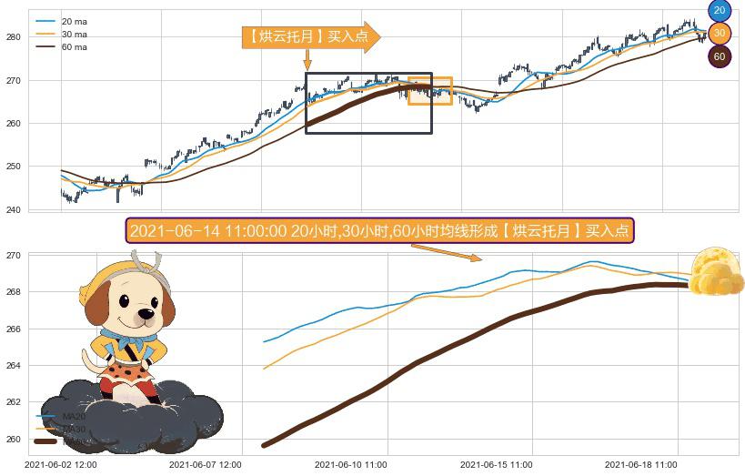⚀ 2021-06-07 15:00:00小时-2021-06-18 15:00:00小时显现 20小时-30小时-60小时均线 【烘云托月】买入点 看多信号,后市看涨,买入