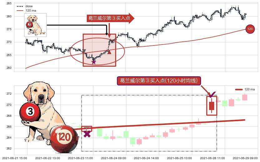 ⚀ 2021-06-28 09:00:00-小时显现 葛兰威尔均线 120小时均线 第③买入点 上升趋势的中继信号,后市看涨,买进信号