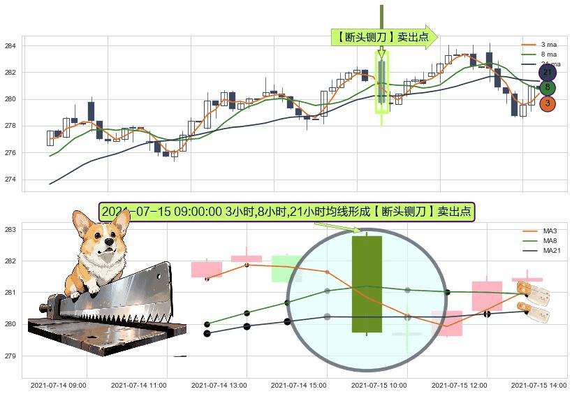 ⚀ 2021-07-15 09:00:00小时显现 3小时-8小时-21小时均线 【断头铡刀】卖出点 看空信号,后市看跌,卖出