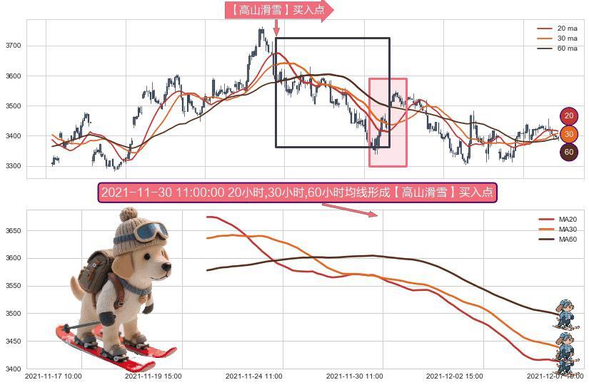 ⚀ 2021-11-22 12:00:00小时-2021-12-06 16:00:00小时显现 20小时-30小时-60小时均线 【高山滑雪】买入点 看多信号,后市看涨,买入
