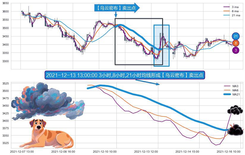 ⚀ 2021-12-09 11:00:00小时-2021-12-15 16:00:00小时显现 3小时-8小时-21小时均线 【乌云密布】卖出点 看空信号,后市看跌,卖出
