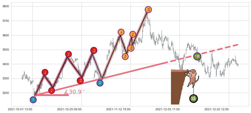 ➣ 2021-10-04 12:00-2021-11-26 11:00上升趋势存在反转[风险],其原上升趋势的支撑位(3534.52)已破位[强阻力信号],原上升趋势角度: 30.9˚