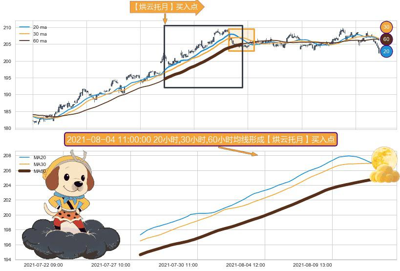 ⚀ 2021-07-27 13:00:00小时-2021-08-11 14:00:00小时显现 20小时-30小时-60小时均线 【烘云托月】买入点 看多信号,后市看涨,买入