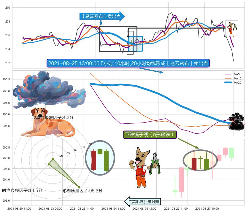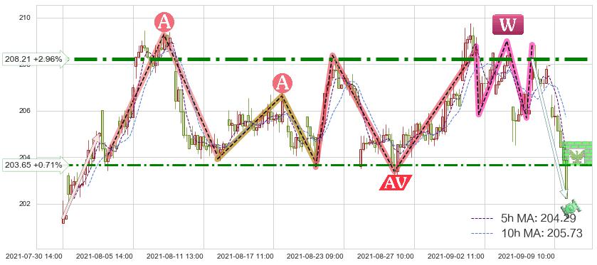 ♞ 5小时均线:204.29,10小时均线:205.73→ 快线<慢线