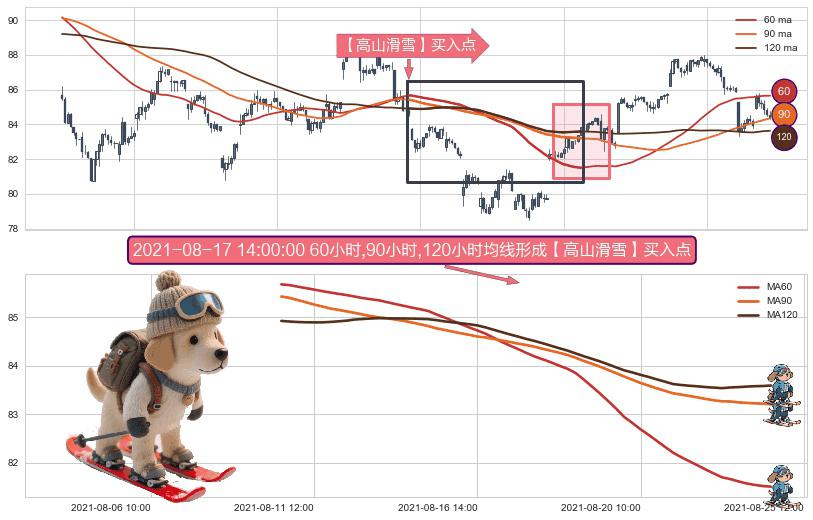 形态多维评估: ⚀ 2021-08-10 14:00:00小时-2021-08-24 14:00:00小时显现 60小时-90小时-120小时均线 【高山滑雪】买入点 看多信号,后市看涨,买入