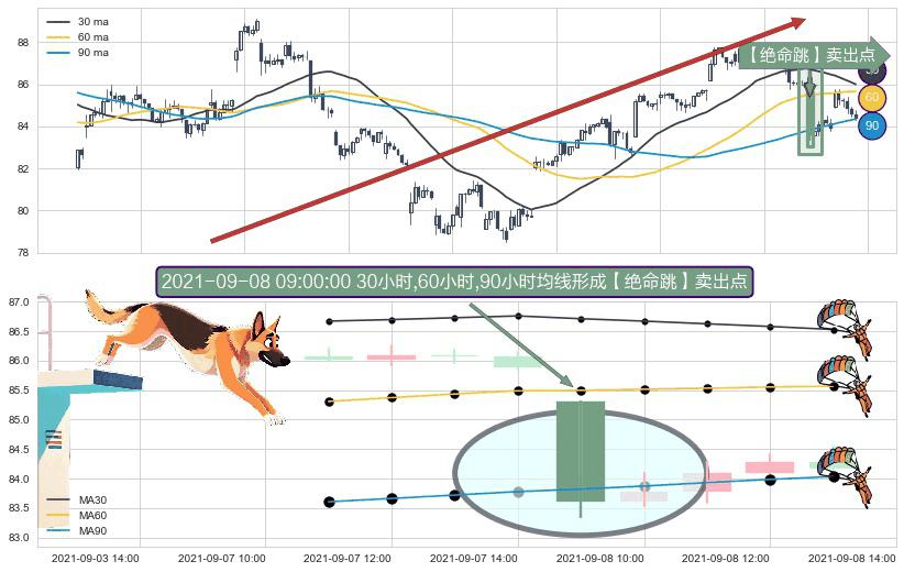 形态多维评估: ⚀ 2021-09-08 09:00:00小时显现 30小时-60小时-90小时均线 【绝命跳】卖出点 看空信号,后市看跌,卖出